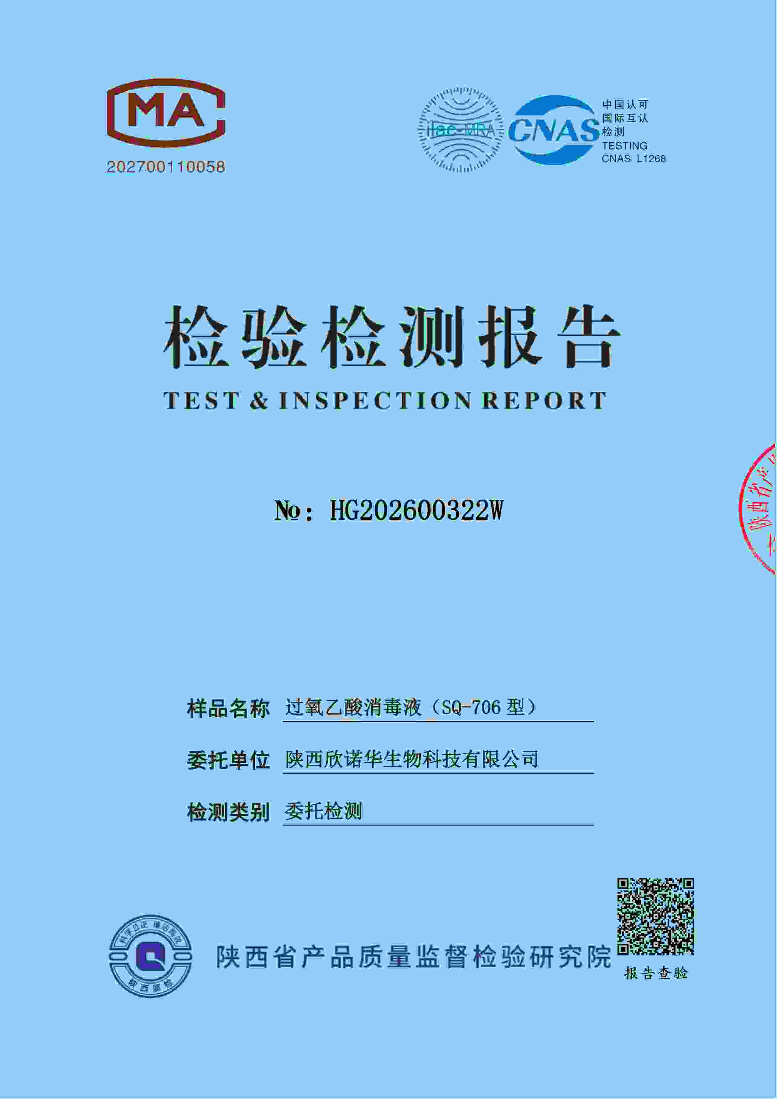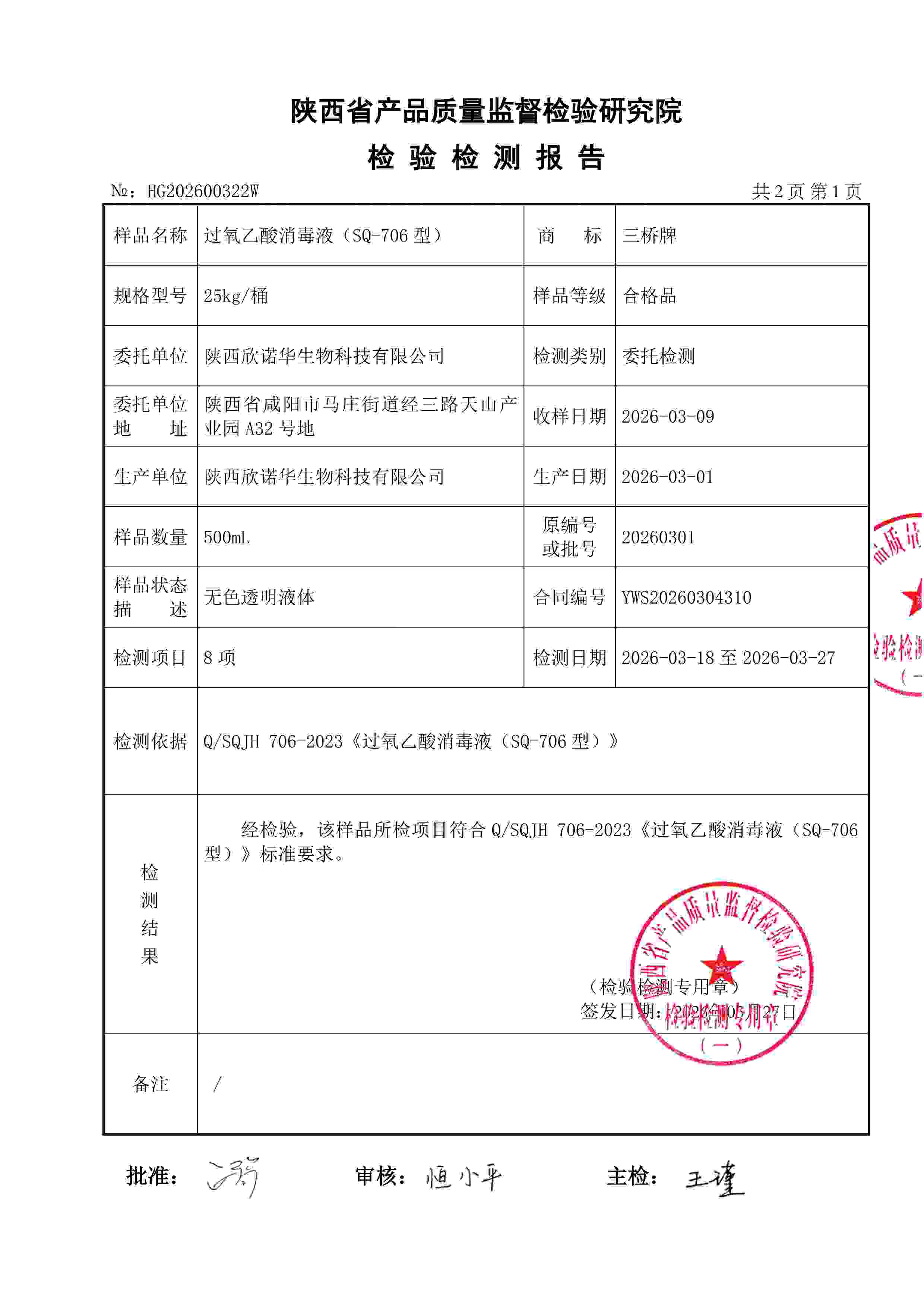 三橋牌過(guò)氧乙酸消毒液檢測(cè)報(bào)告(2026年度)-陜西欣諾華生物科技有限公司