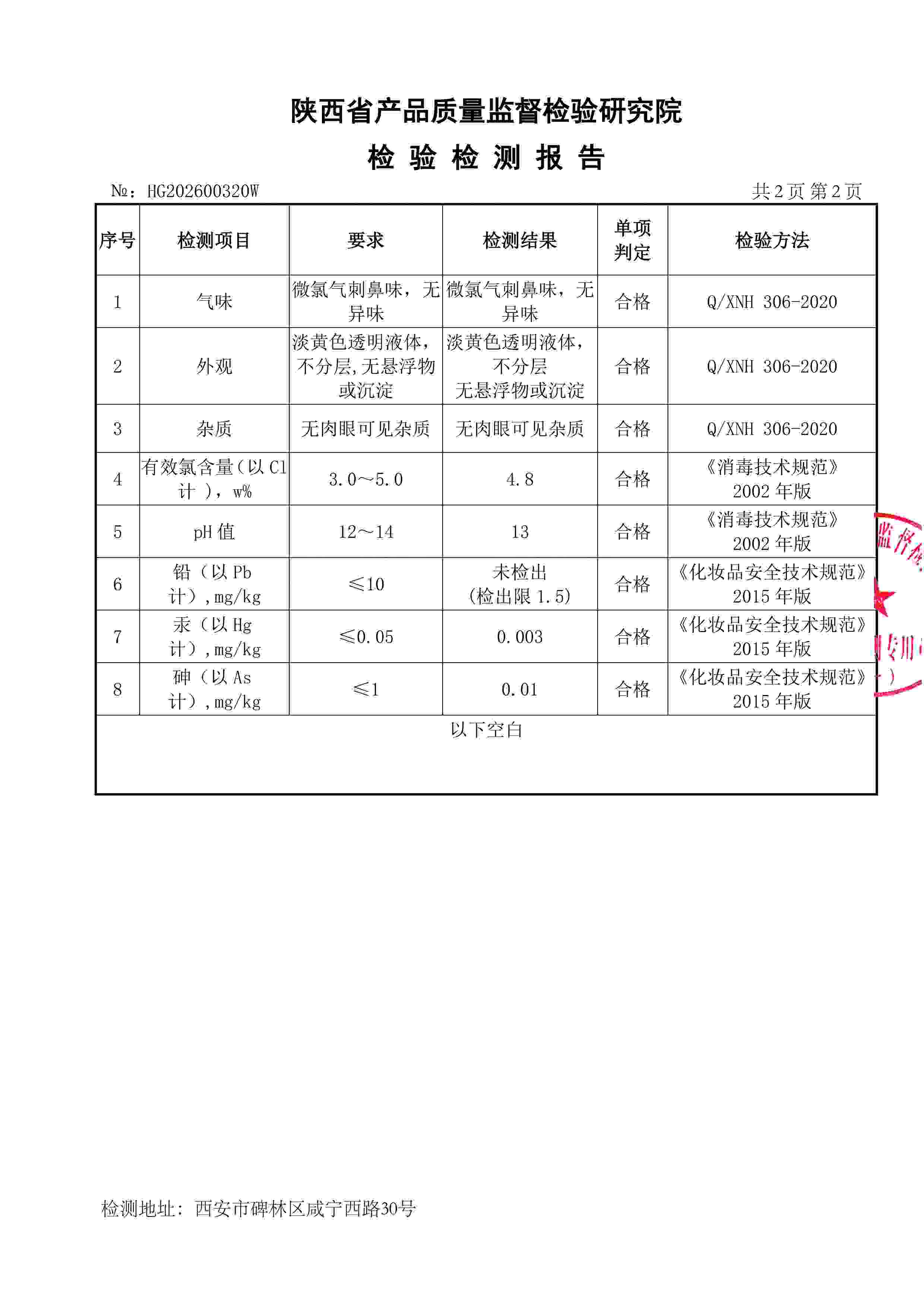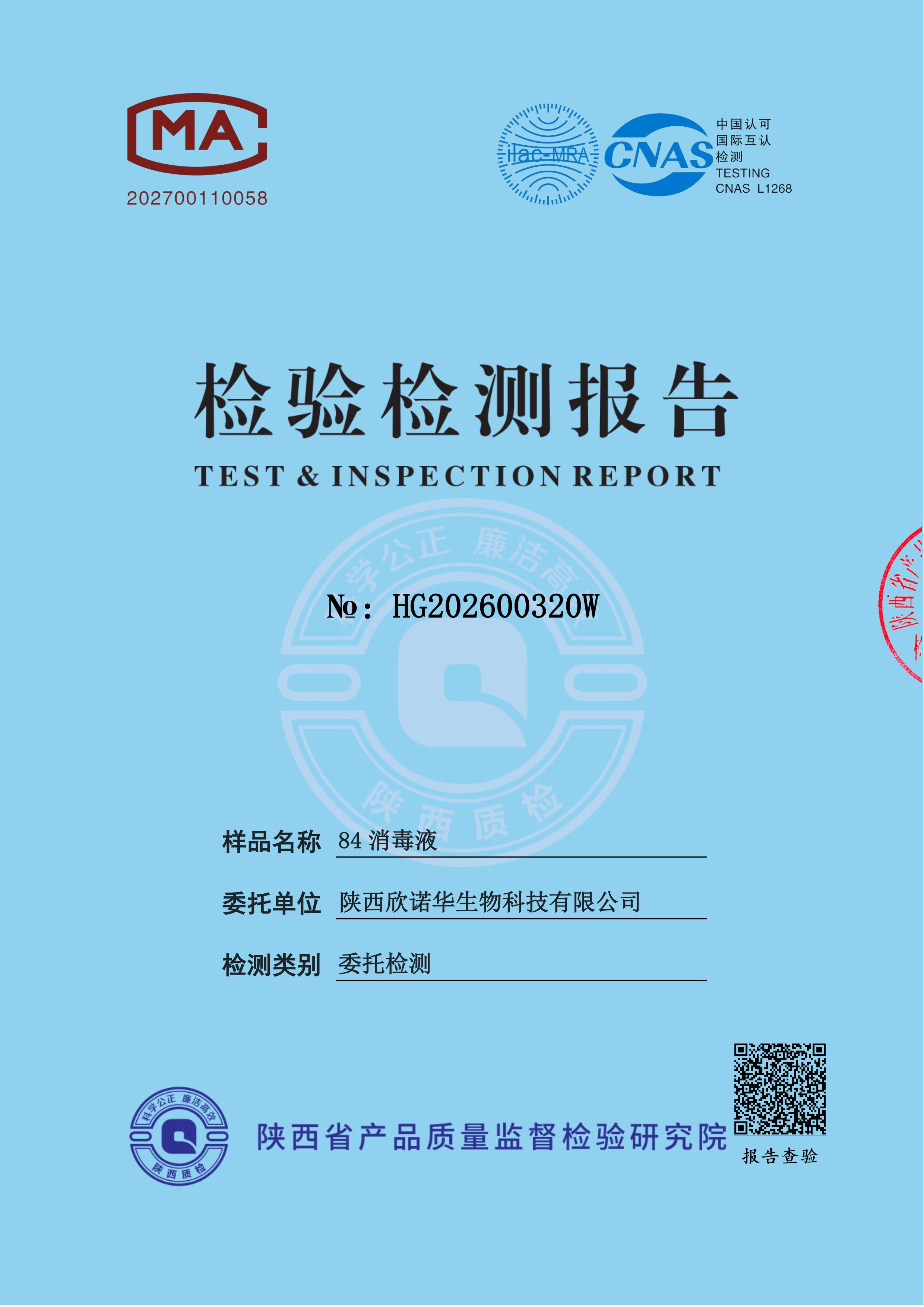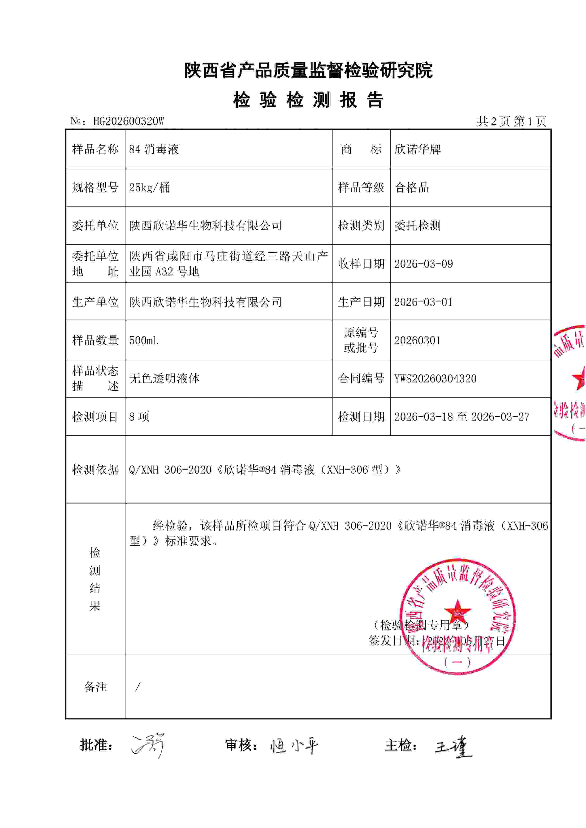 欣諾華牌84消毒液檢測(cè)報(bào)告(2026年度)-陜西欣諾華生物科技有限公司
